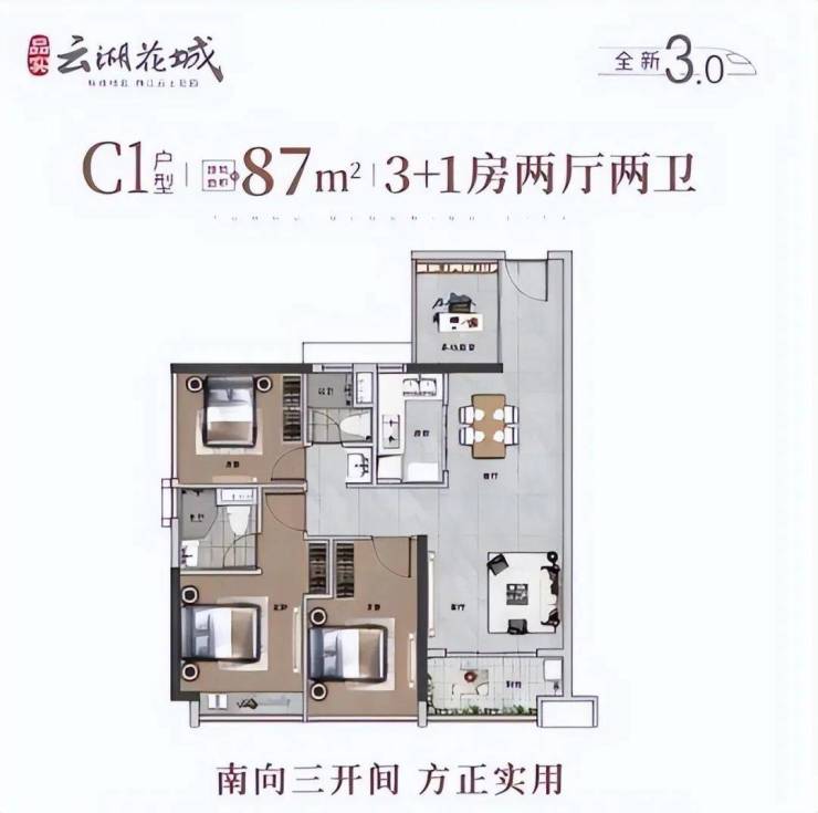 87㎡3+1房2厅2卫,简直是刚需之光!难得的是此户型还享三开间朝南,两个卧室还可望18万方园林。