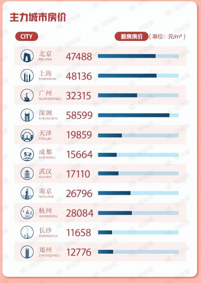 报告显示,5月65城新房线上均价为17549元/㎡,环比上涨0.11%,全国重点65城中有26城新房房价环比上涨。一线城市中,深圳新房线上均价为58599元/㎡,上海和北京新房线上均价分别为48136元/㎡和47488元/㎡,广州新房线上均价为32315元/㎡。