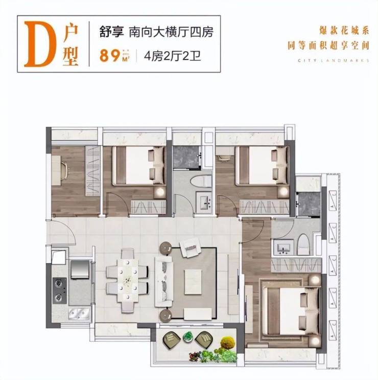 较大面积段89㎡为四房两厅两卫,传统竖厅设计连通阳台,南北对流设计,采光通风俱佳,而且每个卧室的位置都很正,不像大部分N+1设计的户型,在入户门口设置的鸡肋房间,实用性得到保障。