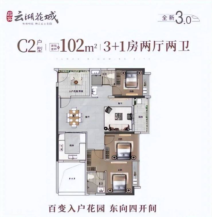 预算充裕的买家则可考虑102平四房户型,双主套双阳台东望白云湖,餐客一体,流畅生活动线,赠送面积多达20㎡,实用率高达97%!居住舒适性将进一步提升。