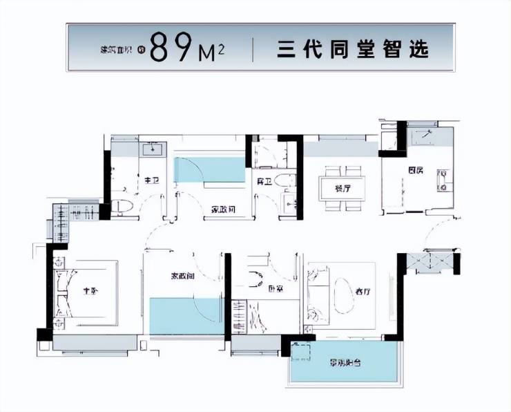 89㎡四房两卫为横厅单位,减少了过道的空间浪费,利用率更高,此外四开间朝南,通风采光更佳。相对83平的户型 ,户型更加方正,居住舒适性也有所改善。