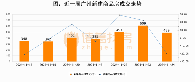 根据广州市住房和城乡建设局数据显示,2024年11月24日广州新建商品房成交489套,较昨日减少120套,环比下降19.7%