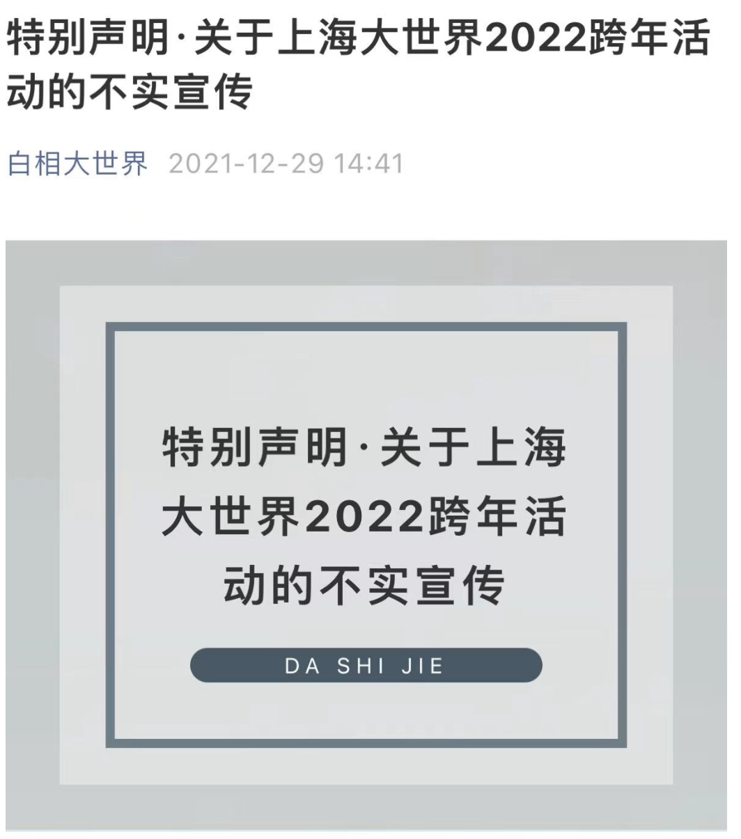 近期,我们收到众多新老朋友关于“大世界2022年跨年夜市活动”的咨询,经调查,源于部分博主在社交媒体上发布的“2022上海跨年活动合集、活动推荐”等博文中提及“上海大世界将推出2022年跨年倒计时、人工降雪、夜间集市等活动”等相关宣传信息。上海大世界在此特别声明,以上宣传均为不实消息,2022年跨年期间,大世界夜场将不再举办倒计时、舞台表演、人工降雪等特别庆祝活动,敬请广大市民游客切实辨别,以防给您的出行游乐造成不愉快的体验和不必要的麻烦。