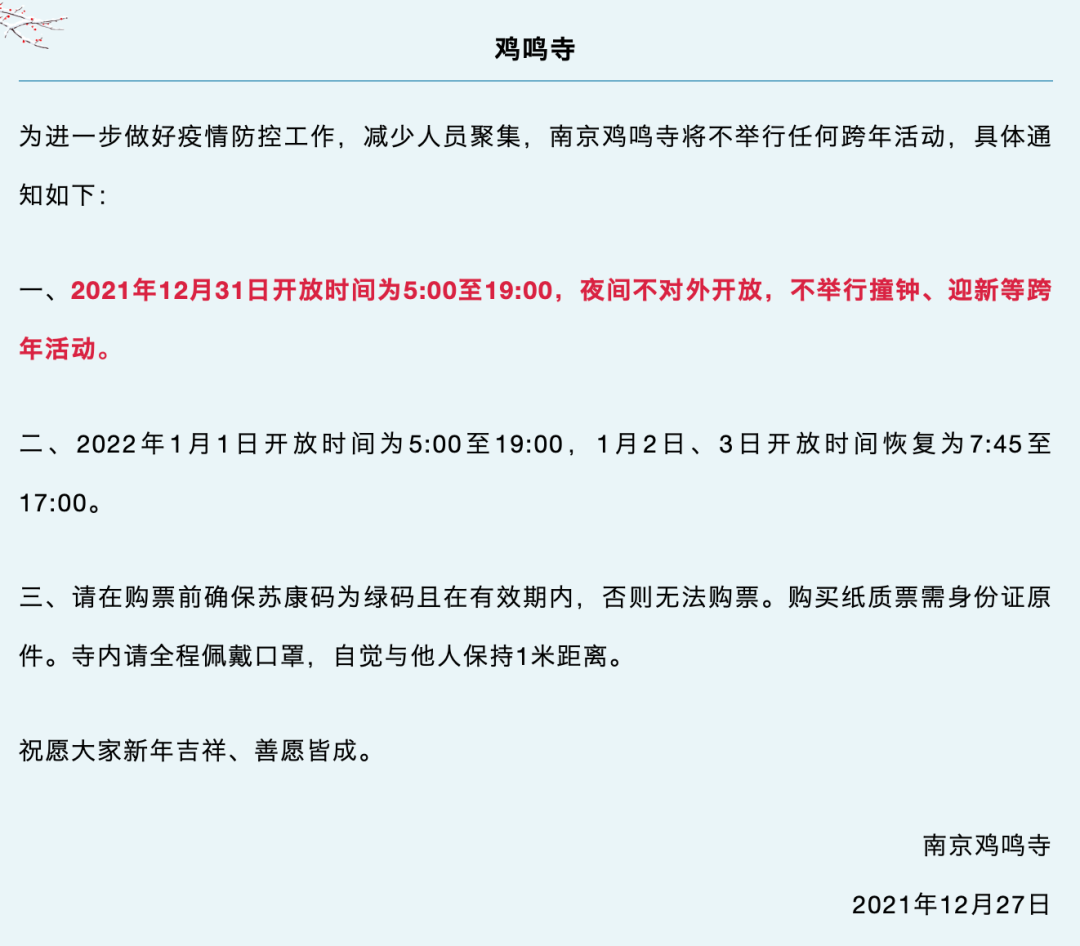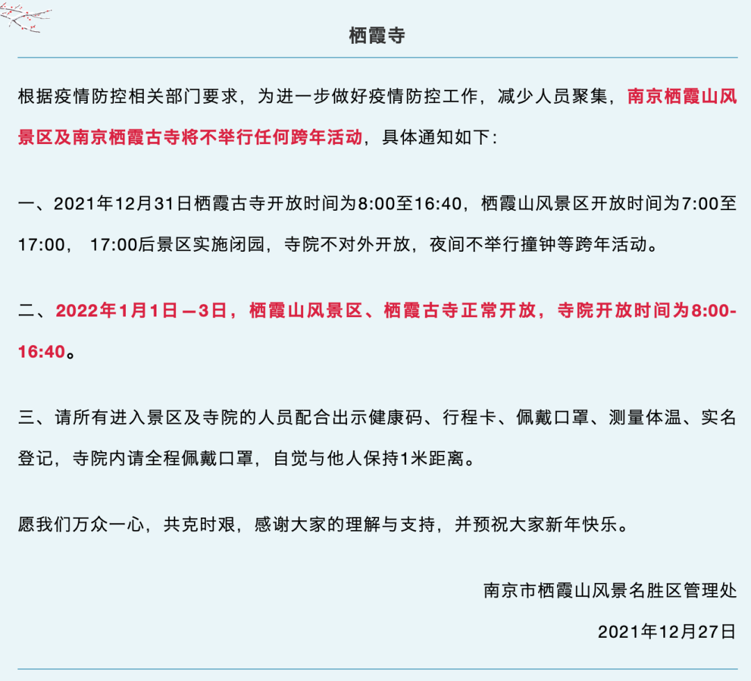 栖霞寺、鸡鸣寺等:不举行任何跨年活动
