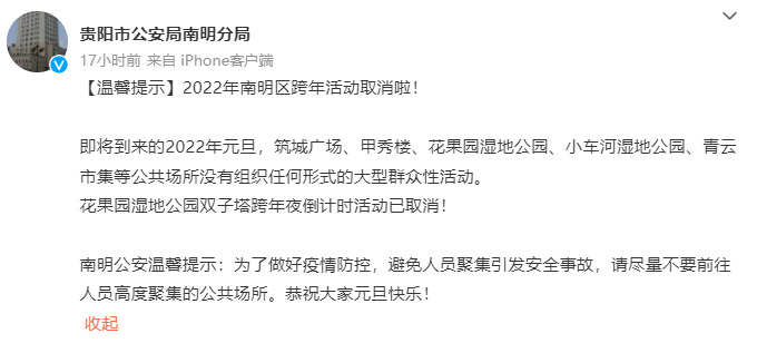 贵阳市公安局南明分局:双子塔跨年夜倒计时活动已取消