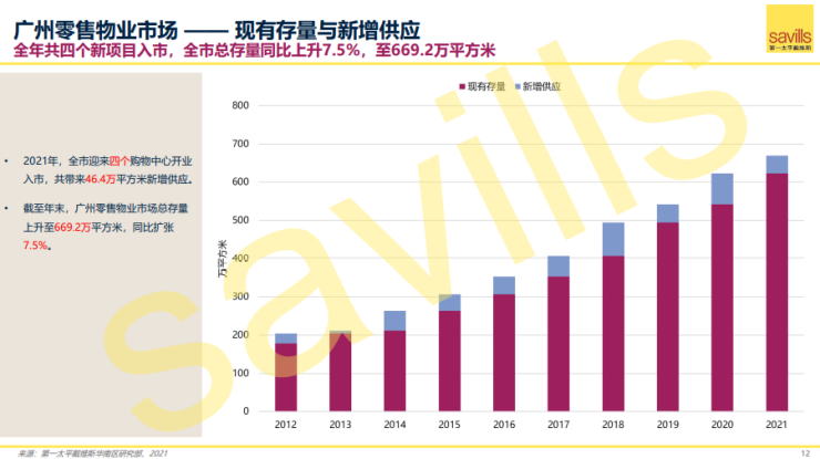 2022年,全市预计迎来四个购物中心开业入市,共市场带来47.4万平方米新增供应。至年底,广州零售物业市场总存量预计同比扩张7.1%,至716.7万平方米。