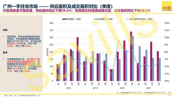2021年,因受年初以来预售审批、备案价管控从严等调控政策影响,开发商推盘节奏较去年放缓。截至12月17日,广州一手住宅供应面积累计达771.2万平方米,同比下降14.9%。其中,第四季度,全市一手住宅市场供应面积环比下降24.0%至206.0万平方米。