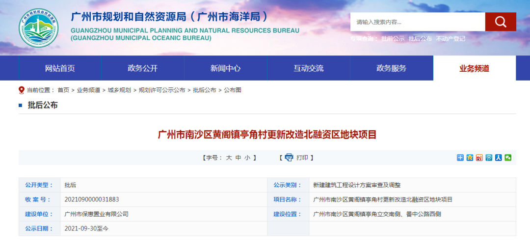 近日,市规自局对广州市南沙区黄阁镇亭角村更新改造北融资区地块项目进行批后公示。