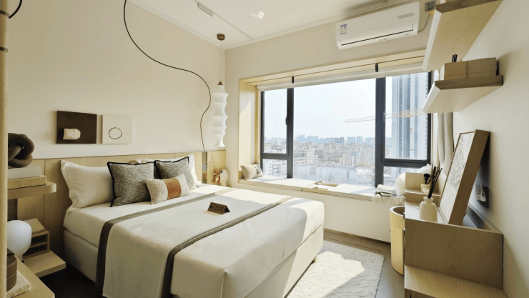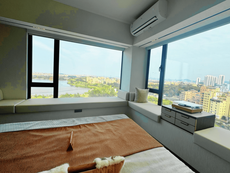 主卧搭配双面瞰景飘窗,引园景入室更可远眺湖景,夫妻俩晚上在这喝茶赏景,关上门就是二人世界。