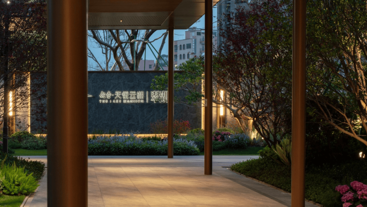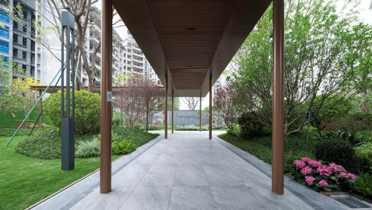 穿过门楼,礼仪归家大道两侧香樟列阵相迎,夹道红果冬青与迎客松姿态舒展,花烟草、海藻树等植被层层叠翠,打造移步异景的归家动线