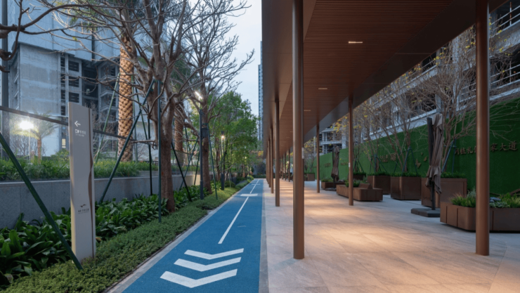 环形健康跑道串联全龄活动空间,300 米环线覆盖热身、休憩、拉伸等功能,适配多样运动需求。