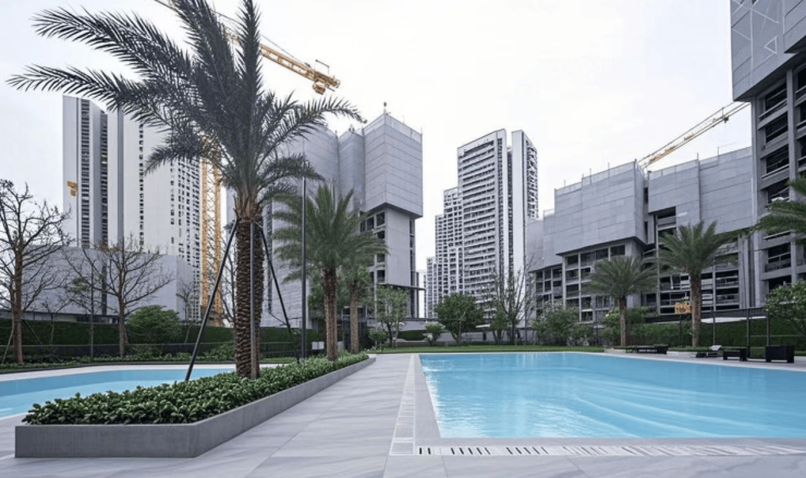 社区内规划约 400㎡双泳池系统,成人池与儿童池分区设计,搭配热带风情植,营造 “家门口的度假胜地”。