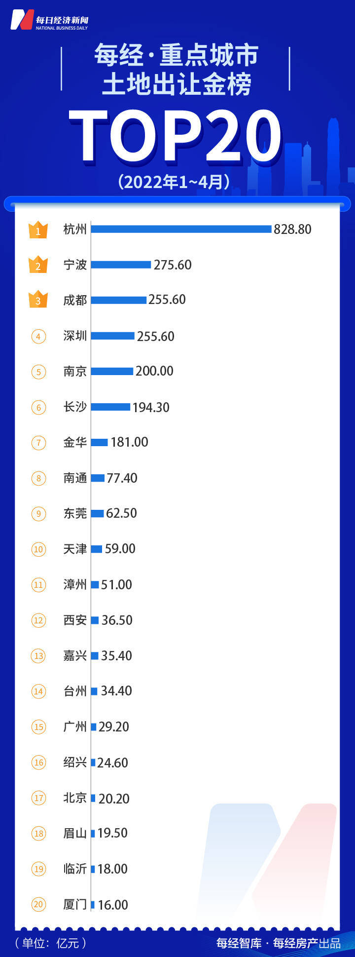 在杭州土拍火热的助力下,4月全国土地出让金TOP20城成交规模达到2437亿元,比3月份上涨70%,成为2022年以来金额较高的月份。