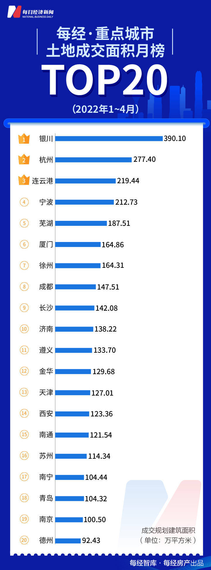 其中成交规划建筑面积排名前列名的城市为银川,成交面积390.1万平方米,杭州紧随其后。