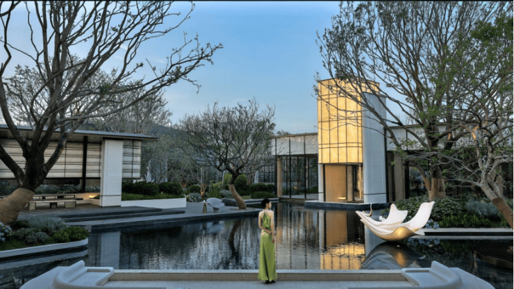 镜面水系如液态天幕铺展,琉璃光塔倒影与日光共舞,营造空灵禅境。纽约安曼同款黑晶水盘倒映天光云影,20年虬劲朴树沉淀时光痕迹,36片琉光宣纸玻璃墙轻盈隔绝尘嚣,瞬间澄澈心境。