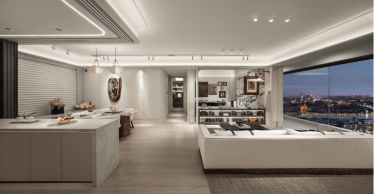 昭示层峯气度,以横跨约12m南向全景玻璃幕墙,迎接如瀑天光,室内时刻浸润于通透光感之中。近60㎡一体化LDKGX无界方厅,极致消弭边界,社交宴饮、家庭欢聚、惬意起居于此随心交融,成就至臻生活主场。开放式中西双厨布局,令米其林级家宴筹备游刃有余,亲子烘焙时光倍添温馨。