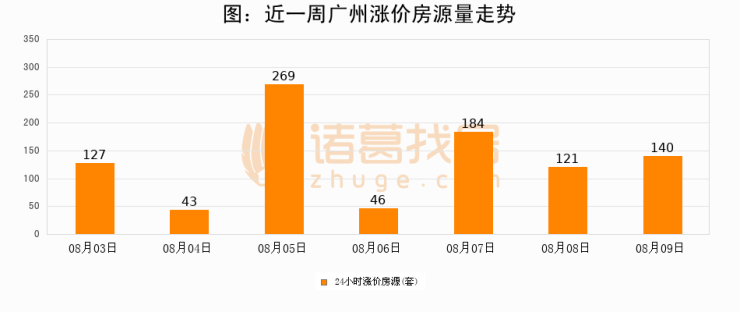 根据诸葛找房数据显示,广州24小时涨价房源量为140套,较08月08日增加19套,环比上涨15.7%。与此同时,涨价房源占比小幅扩大,业主信心有所提升。
