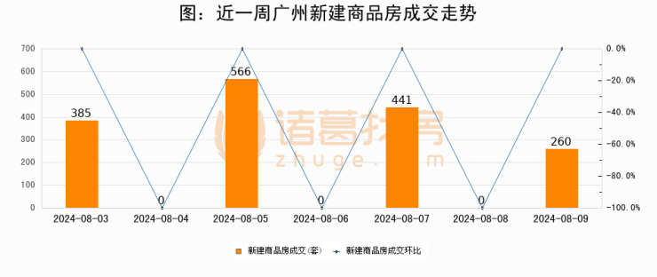根据广州市住房和城乡建设局数据显示,2024年08月09日广州新建商品房成交260套,较昨日增加260套,环比上涨0%