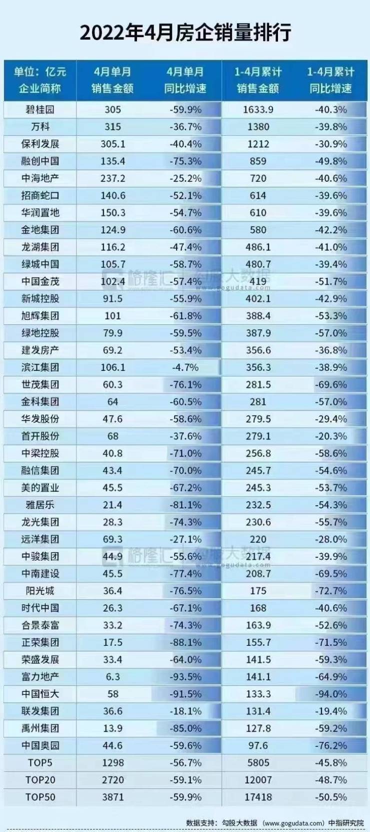 5月7日,据格隆汇统计数据显示,部分房企4月销售降幅进一步扩大,。据中指研究院数据,2022年1-4月,TOP100房企销售额均值为212.2亿元,同比下降50.2%;其中销售额超千亿房企3家,较去年同期减少…