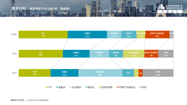 需求方面,传统支柱行业的大企业办公需求相对稳定,专业服务业、TMT及金融业仍然作为三大主力引领市场成交,全年贡献了近七成的成交面积。其中,专业服务与金融业与去年相比需求有所扩大,成交占比同比分别扩大15.1和1.2个百分点。复杂的市场环境下,企业对会计、审计、税务、法律等专业服务的需求有所上升,推动行业业务扩张,一些机构在华南增设新的营业点或扩大现有办公空间。另外,疫情对保险服务、医疗健康等行业也产生推动作用,令其办公需求持续上升。IT行业仍保持活跃,但业务增长速度有所放缓。同时,房地产行业受宏观政策调控影响,业务收缩,导致需求逐年下降。