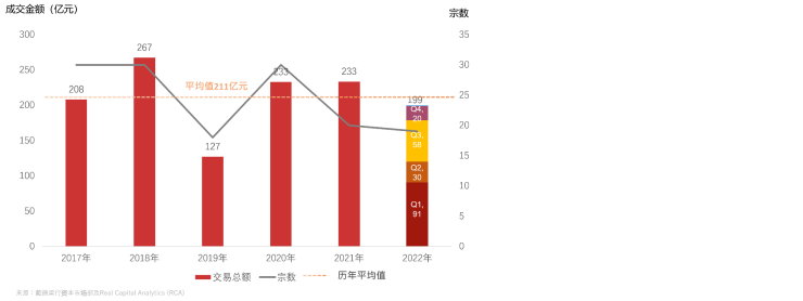 2022年全年广州商业房地产大宗交易共录得19宗成交,成交总额为199亿元,成交总额同比下降约14.7%,较近6年平均成交额(约211亿元)也略低。其中一季度成交额超过90亿元,均是2021年已敲定的交易,未能真实反映投资者的情绪,后三个季度的成交额接近110亿元,其中约有30亿元是因以物抵债而发生的产权转移,主动交易仅约80亿元,投资者仍然保持审慎的投资态度。