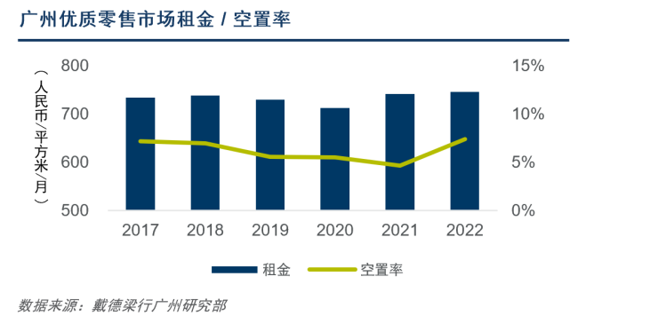由于年内疫情反复,线下经营活动受到管控,令购物中心客流量受到巨大影响。12月,尽管经营性场所在防疫管控措施优化下恢复正常秩序,但消费活力与市场需求的全面复苏仍然需要一段时间。全市空置率同比上升2.7个百分点至7.4%,各商圈空置率均有不同程度上涨,其中番禺和白云商圈受疫情影响较大,空置率上涨幅度明显,分别上升4.2和2.6个百分点。四季度末观察到一些购物中心在防疫措施优化后,积极筹备主题活动和布局调整来推动客流量的回升。