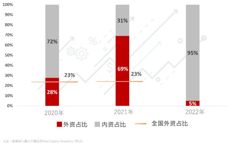 从资金来源看,2022年全年成交额中95%是由内资买家完成,仅有一宗交易是来源来自于外资投资者。一方面是由于疫情反复,限制外地投资者来穗进行投资活动,另一方面,受近两年房地产市场调整、经济预期不明朗、汇率变动等因素影响,外资投资者决策周期拉长,致使外资比例有所下降。
