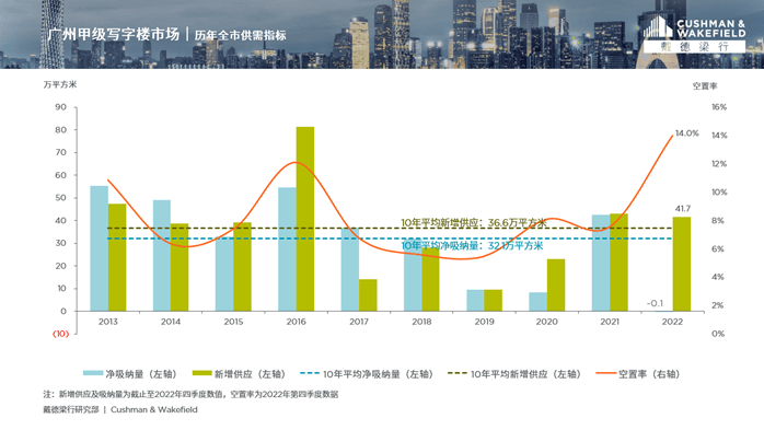 2022年,广州甲级写字楼全年新增供应约为41.7万平方米,供应量与去年基本持平。其中超过八成的新项目位于琶洲商务区,市场规模突破600万平方米。一些原计划于年内入市的项目因疫情影响而推迟交付,或令明年供应量达到新高。