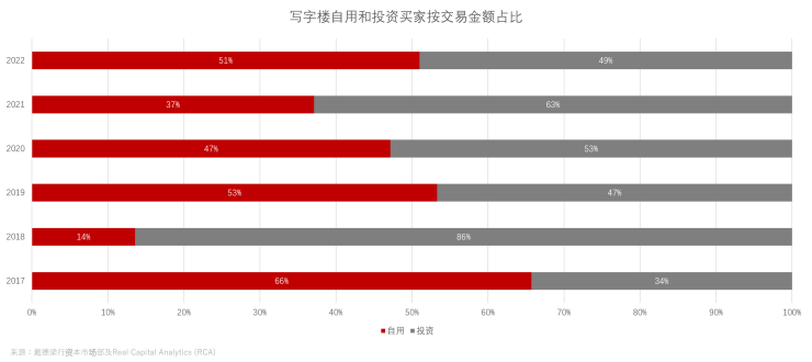 办公含研发办公物业仍然是最受投资者青睐的物业类型,2022年办公类物业成交额占比达65%,而办公类别成交额中51%为自用买家购置物业作为总部/区域总部办公之用,如太平洋保险购入粤海金融中心T1座、九毛九集团董事长购入广州国金天地项目部分楼层、利口福集团(广州酒家)购入广州信息港D座等。近年金融、TMT、餐饮、物流等领域的企业办公场所需求增加,其购买力较强,逐渐成为大宗交易市场主力军之一。