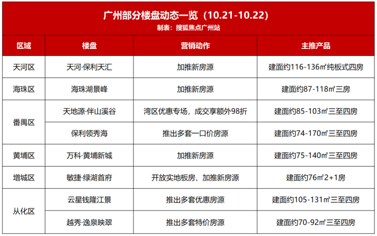 据搜狐焦点了解,天河·保利天汇、海珠湖景峰、天地源·伴山溪谷、保利领秀海、万科·黄埔新城、云星钱隆江景、越秀·逸泉映翠、敏捷·绿湖首府等多盘中,要么加推新货,要么推出多套特惠房源,要么举办优惠专场活动,成交享额外98折,引人关注。