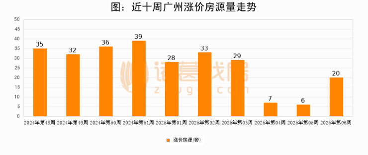 从调价房源来看,第6周广州涨价房源20套,较上周上涨233.3%。与此同时,6周涨价房源占比提升3.81个百分点,业主信心持续恢复。