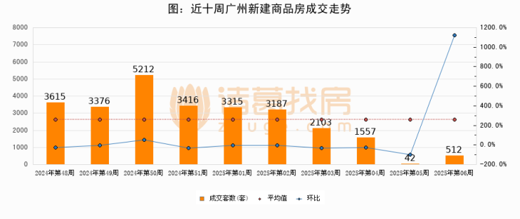 进入2025年第06周(02月03日-02月09日),广州新建商品房成交512套,较上周增加470套,环比上涨1119%