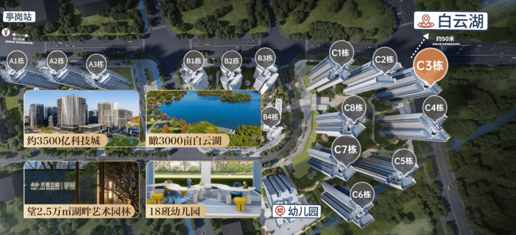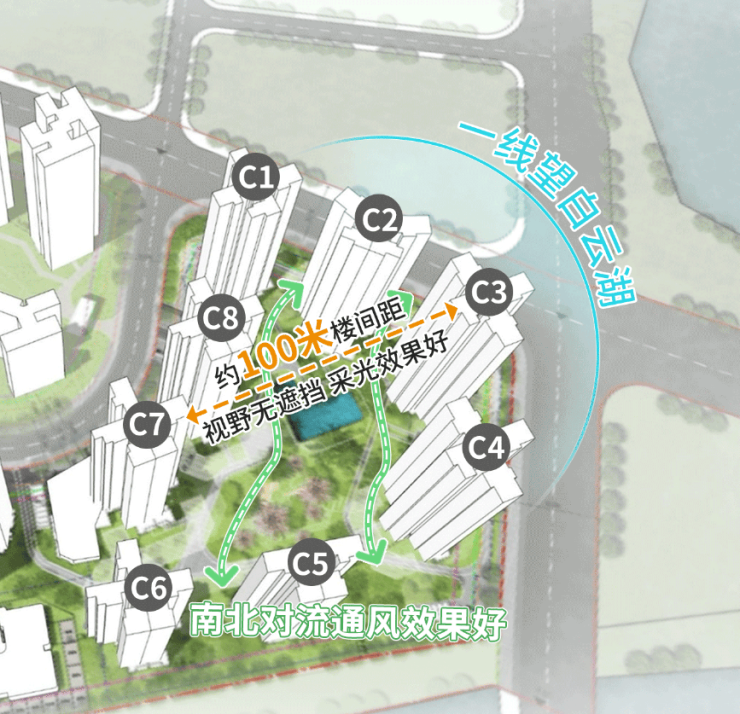 C3 栋雄踞社区湖景头排 C 位,距白云湖仅约 50 米,是整个地块中离湖岸线最近的楼栋,因此拥有更为开阔的湖景视野,真正做到将湖景资源独揽于怀。