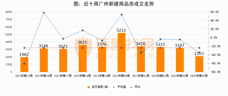 进入2025年第03周(01月13日-01月19日),广州新建商品房成交2103套,较上周减少1084套,环比下降34%