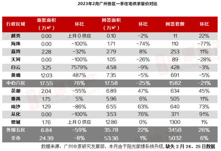 据广州市房地产中介协会统计,2月广州二手住宅成交上,广州外围区域的南沙区、花都区、增城区和从化区网签面积环比分别增长101.05%、103.55%、89.44%和81.18%,均高于中心城区;番禺区网签面积环比则增长68.10%。