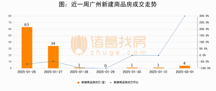 根据广州市住房和城乡建设局数据显示,2025年02月01日广州新建商品房成交4套,较昨日增加3套,环比上涨300%