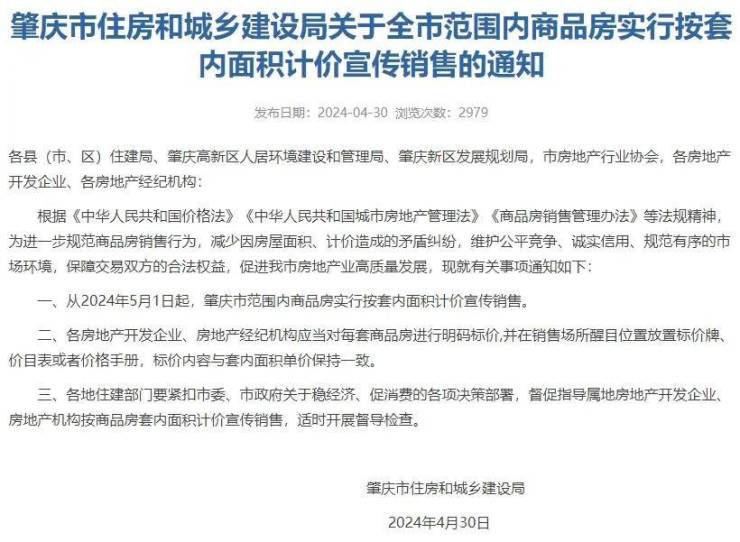 日前,广东省肇庆市率先发布商品房实行按套内面积计价的通知,明确从2024年5月1日起,肇庆市范围内商品房实行按套内面积计价宣传销售。