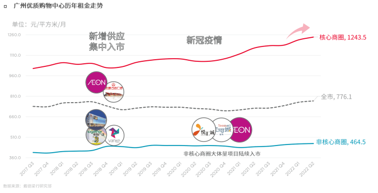 今年前四月,全市社会消费品零售总额同比仅增长0.3%。上半年多点频发的本土疫情令线下消费活动受到影响,一些新项目的开业计划也因此受到影响而延期。2022年上半年,广州优质零售市场共有14.0万平方米新增供应入市,均位于外围商圈。宏观经济承压使得消费者更加追求理性消费,因此也带动了折扣零售业态的兴起。在多数品牌方延缓拓店计划的同时,多家零售折扣店不断扩张,积极进入购物中心、社区商业等不同的消费场景。例如广东排名前列盒马鲜生奥莱店落地荔湾商圈,广州排名前列UR奥特莱斯店进驻5号停机坪,显示出折扣经济的兴起。