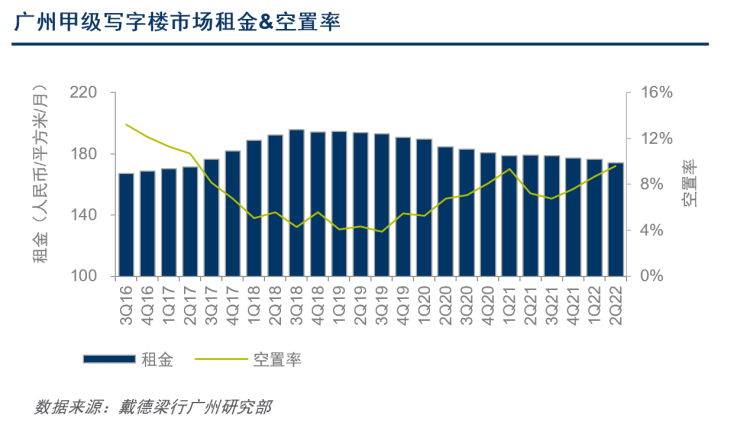 2022年上半年,广州市甲级写字楼市场录得33.2万平方米新增供应,超过去年全年供应量的七成。尽管新增供应持续放量,但由于上半年疫情在国内多个核心城市多发频发,外部环境的不确定性令企业的租赁决策周期有所延长,新增供应对市场需求的刺激作用有限。一线城市写字楼租赁需求节奏普遍放缓,上半年广州市甲级写字楼市场录得18.7万平方米净吸纳量,是去年全年的44.0%。全市空置率延续上升趋势至9.6%。对此,戴德梁行研究院副院长、华南区研究部董事张晓端表示,尽管市场吸纳水平不及预期,但对于广州而言,在长期维持低空置率的市场环境下,新兴商务区持续放量带来可租赁面积的增加,将为租户提供更多可租赁面积的选择,也为未来市场活跃度的复苏提供良好载体。