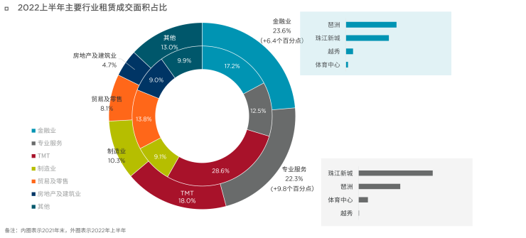 从行业来看,今年上半年行业需求表现出现分化,TMT、房地产及建筑业受到行业调整的影响,需求表现谨慎。另一方面,金融业及专业服务业需求活跃并成为租赁成交的主力,与2021年末相比,其成交面积分别扩大6.4和9.8个百分点,占到全市总租赁成交面积的23.6%和22.3%。今年6月,广州市发布《关于进一步强化金融服务支持疫情防控推动经济平稳健康发展的通知》,在疫情防控趋严的背景下,金融行业对经济平稳健康运行的支持和保障作用得到强化。从区域的选择上来看,除了珠江新城之外,琶洲也是这类行业选址的重要考虑,随着新兴区域产业集聚效应的扩大,企业对于财税金融、人力资源、广告咨询、法律等各类专业服务的需求也将不断上升。