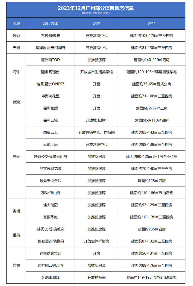 据搜狐焦点、中地行不完全统计,12月广州全市约21个项目有动作,涵盖全新亮相、开盘销售、加推新房源、开放样板间等。