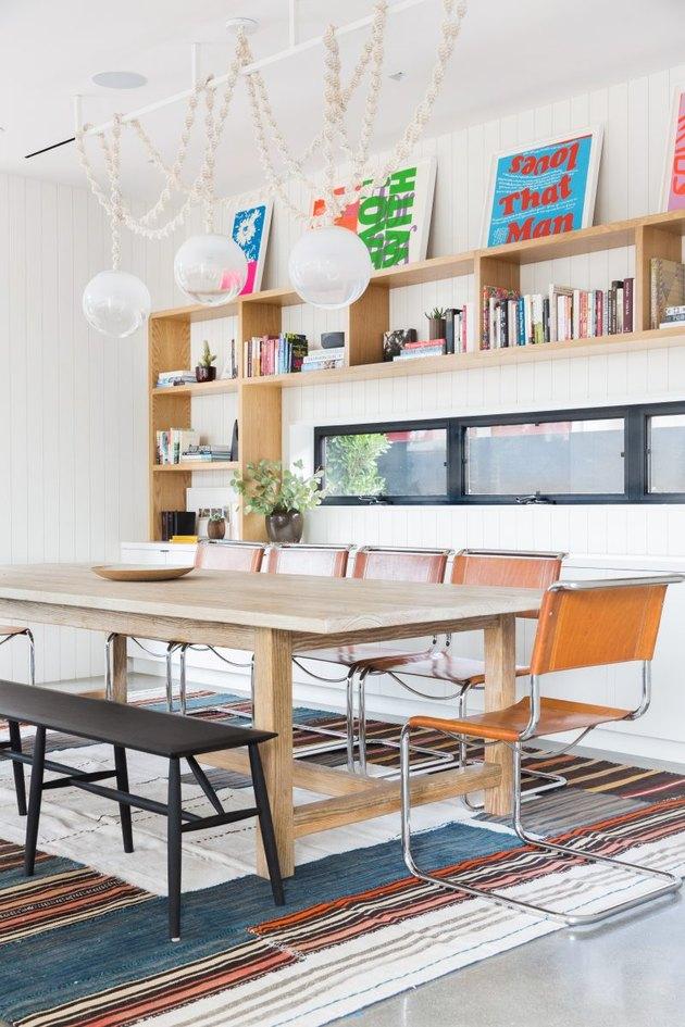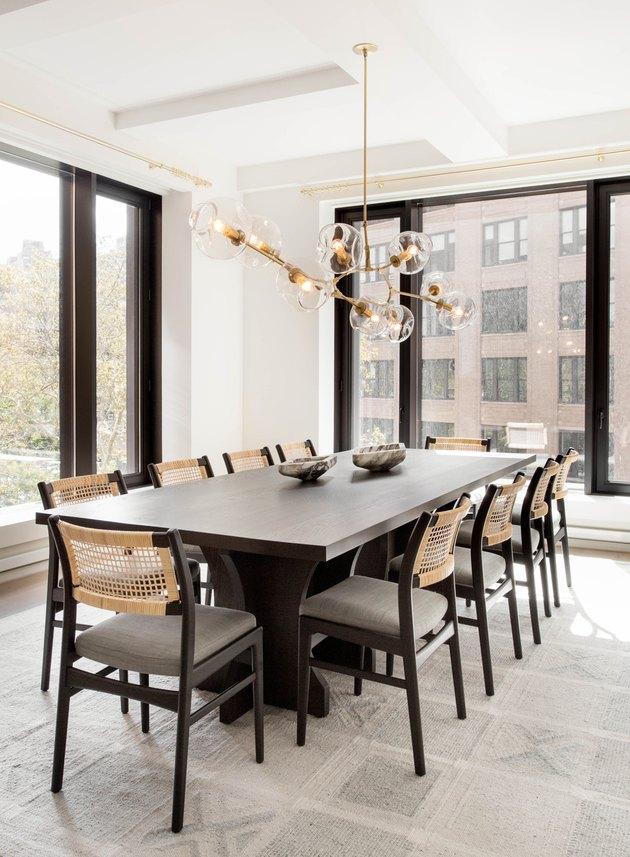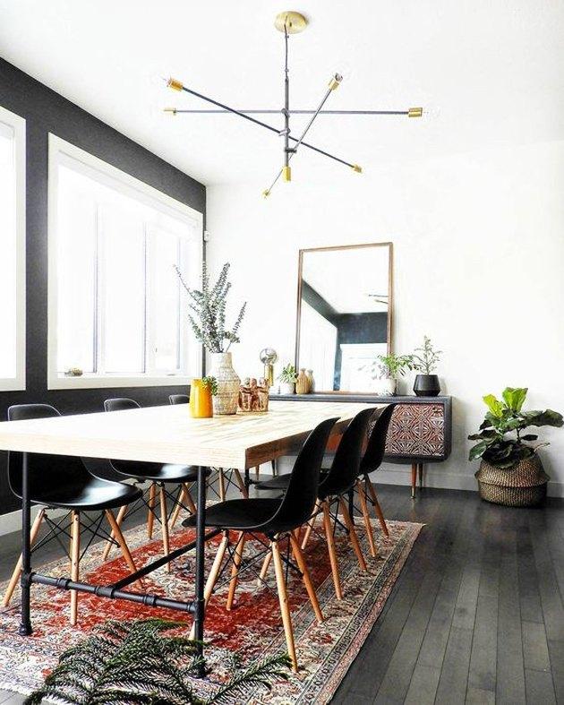 到目前为止,我们已经看到了很多令人晕眩的白色空间,但是有很多理由可以让你考虑使用黑色餐厅。这个例子结合了上世纪中期的家具和一种流行的kilim地毯。