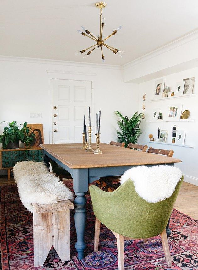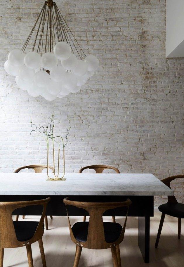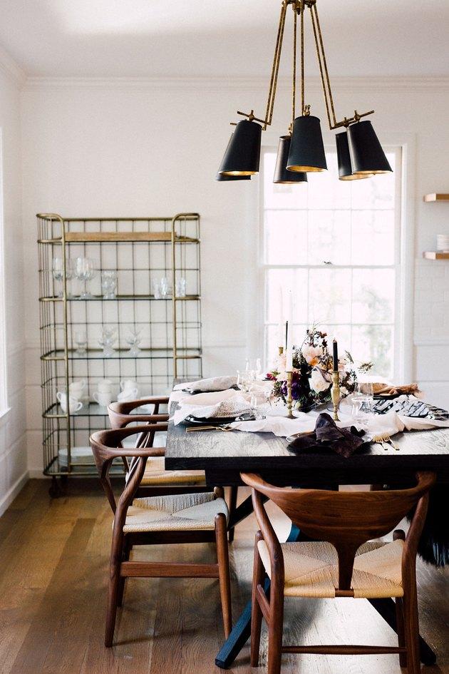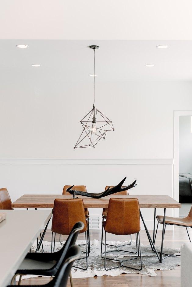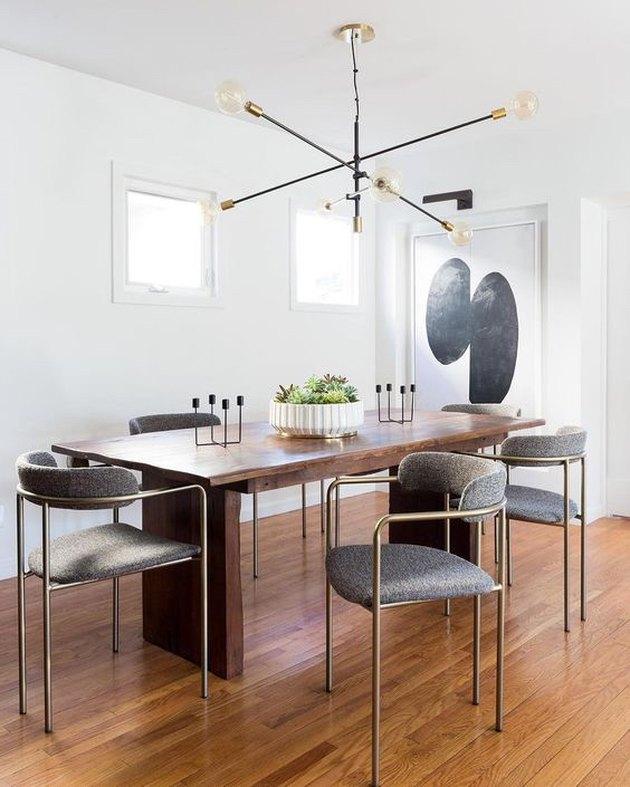 策展空间过多的诀窍是混合搭配。而不是坚持使用六到八把相同的椅子,这款工业小酒馆的枝形吊灯加上超大的艺术品和圆滑的餐桌优质地体现。