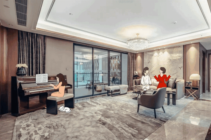 两个居住空间,男主处理工作、女主练瑜珈、老人看电视、小孩练琴…一家三代互不打扰其乐融融。