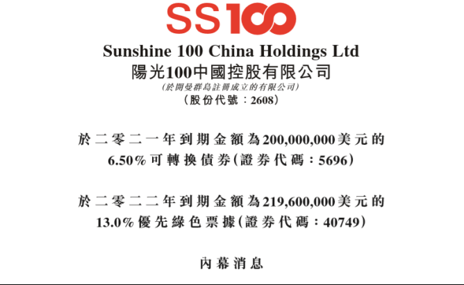 近日,阳光100中国(02608.HK)发布内幕消息称,此前发行的2亿美元6.50%可转换债券到期,但截至到期日,该债券还剩下5091.61万美元本金和147.55万美元利息,合计5239.16万美元待还。不过,阳光100中国已筹措到所需资金,预期到期日后的10个工作日内支付本金连通应计利息。