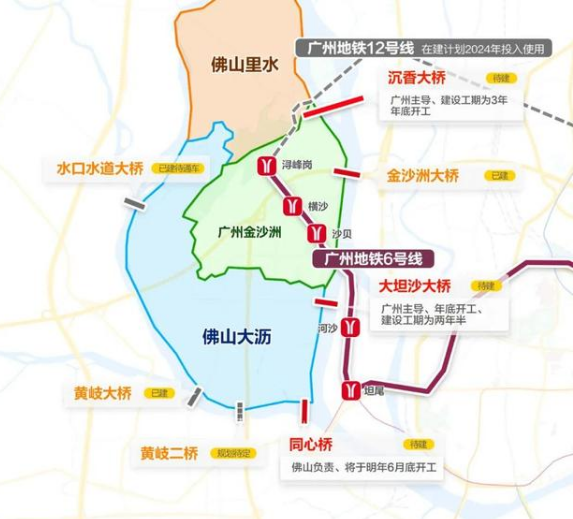 根据规划,金沙洲往广州方向规划有沉香大桥、北环高速、金沙洲大桥、广佛大桥4个主要通道和地铁6号线、12号线贯穿金沙洲地区。