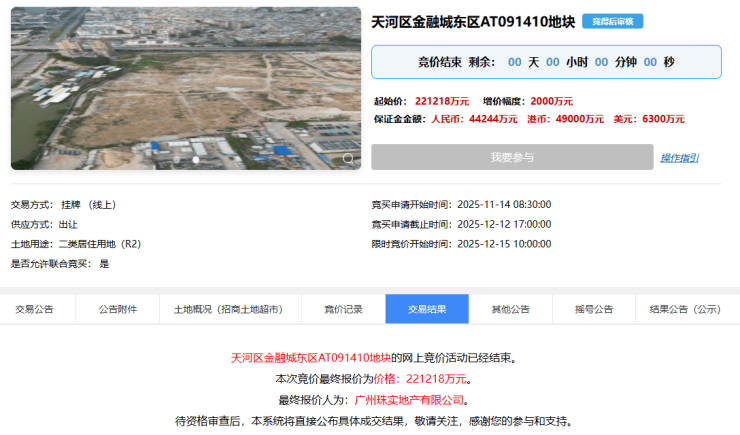 今日(12月15日),备受关注的天河区金融城东区AT091410地块成功出让,由广州珠实地产有限公司以总价221218万元夺得竞得,折合楼面价约4.08万/㎡。地块宗地面积27366.47㎡,计容建面约54220㎡,起拍总价221218万元,容积率3.65。