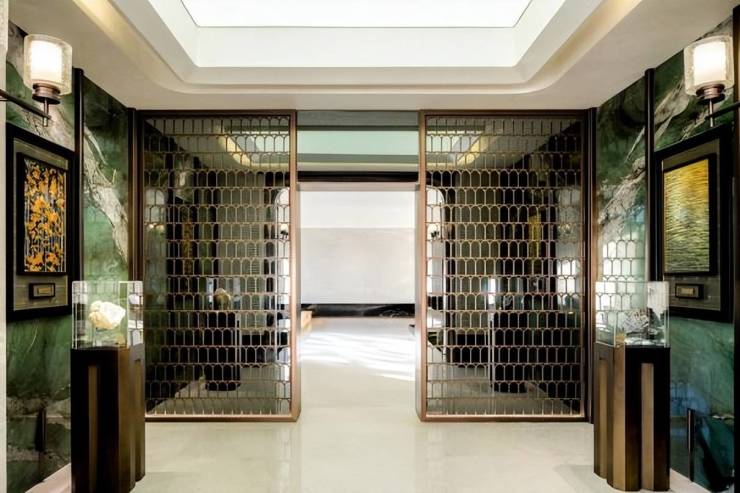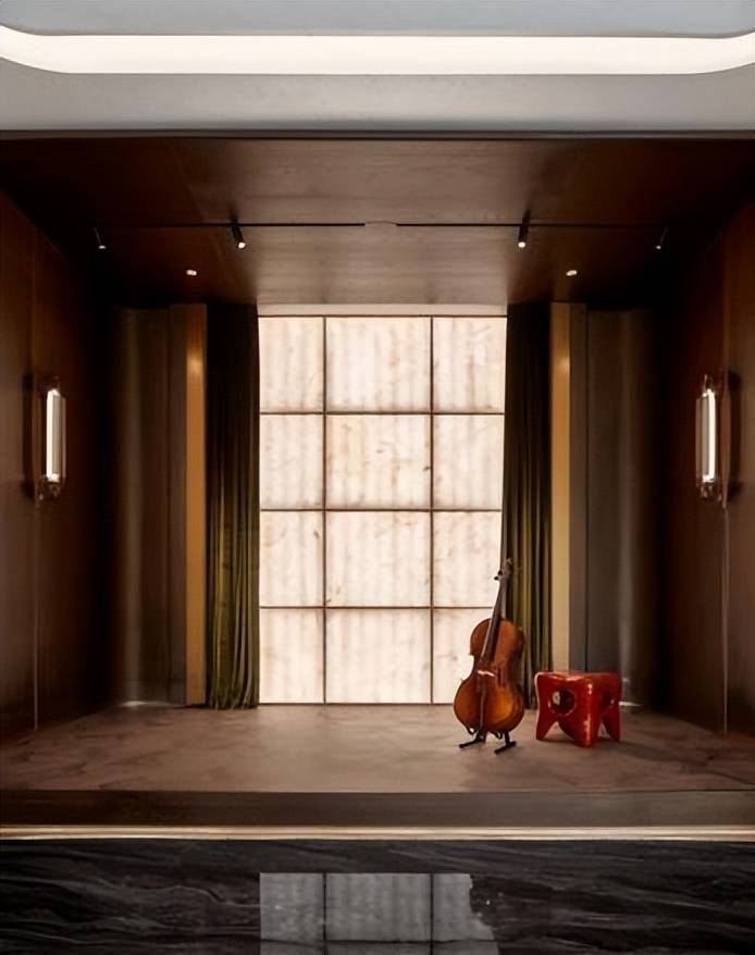 与活力相对的,是2号楼“绿岛艺境”的静谧艺术氛围。空间以独特的“浮岛”高差设计与珍贵的“百达翡翠”石材铺陈,奠定了沉浸式基调。这里更像是家庭的私人艺廊,父母的收藏、孩子的画作都能在此展出,让艺术成为家人之间最亲密的陪伴,在静谧中滋养关于美与成长的日常。