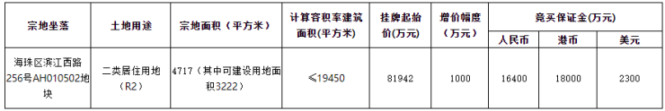 其中,海珠区滨江西路256号AH010502地块为广州广汇房地产开发有限公司 (即越秀)拿下,成交总价81942万元。