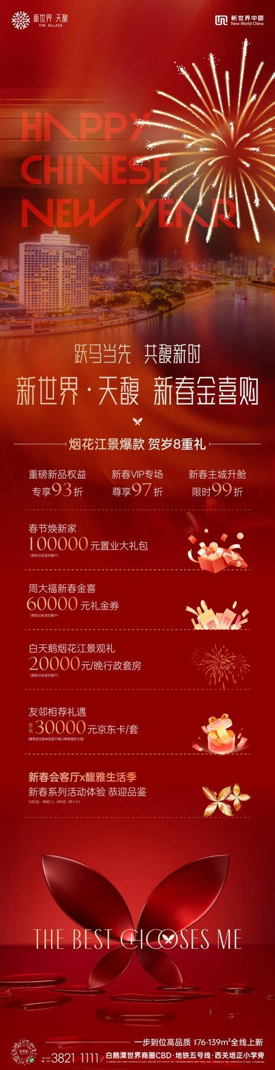 新春置业正当时,新世界·天馥特推出8重购房礼遇,助力湾区家庭焕新家:新春期间购房可享重磅新品权益93折,新春VIP专场专享97折,前20名购房者更可获赠价值100000元的“春节焕新家”置业大礼包、价值20000元的白鹅潭烟花江景行政套房礼遇等。